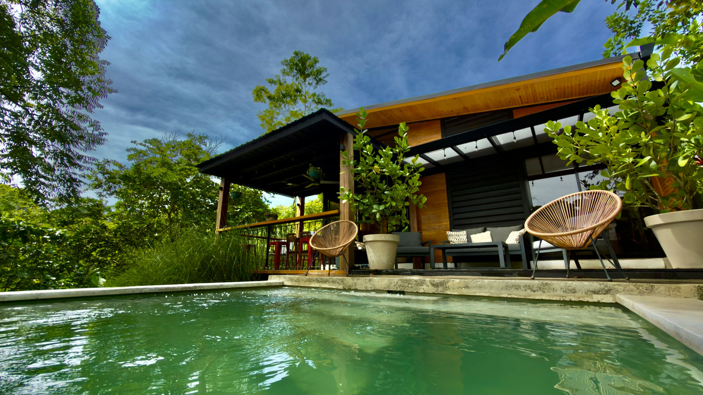 step into your private pool, surrounded by lush vegetation, perfect for soaking up the sun and enjoying a refreshing escape
